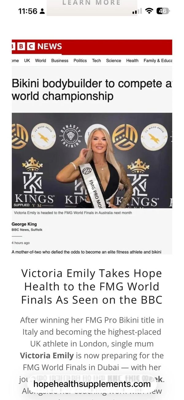 Fizz Marketing sercured national BBC headling coverage for Hope Health Suppleents as part of is strategic launch programme. By positioning Victoria Emily's competition journey and personalised nutrition approach as a compelling media story., the campaign demonstrated the power of effective press relations, strategic timing and authentic brand storytelling. This coverage supported Hope Healths introduction in to the wider industry, establishing early credibility and visibility during is initial growth phase.
